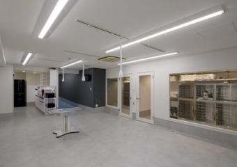 - CTを用いた検査や治療軟部組織外科など難度の高い手術症例にも対応できる1.5次診療の動物病院。横長のテナントスペースの中で、スタッフ様の動線と患者様の動線に配慮したゾーニングに加え、CT機器の積載荷重や搬出入経路を想定しながら、バックヤードのレイアウトを計画。