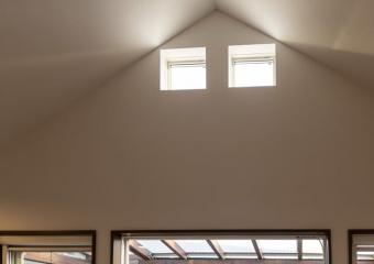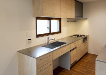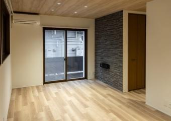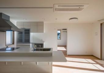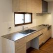 - 戸建て住宅の世帯構成が変化に合わせ、間取りと水周り設備の入れ替え内装を改修。2つの居室に面する仕切壁を梁補強のうえ撤去し、大きな居室に。2階リビングに明かり取り窓を追加、キッチン間仕切を一部撤去し、リビングと跨ぐようにセミオーダーキッチンを設置。